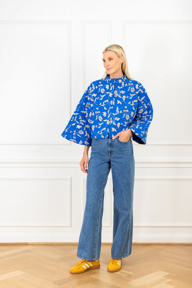 our caftan coat - cropped! the same style you know and love is now offered in a chic short jacket that can be worn open or closed. this jacket features a 100% cotton, quilted fabrication showcasing a classic floral print of delicate beige & ivory florals against a royal blue background.