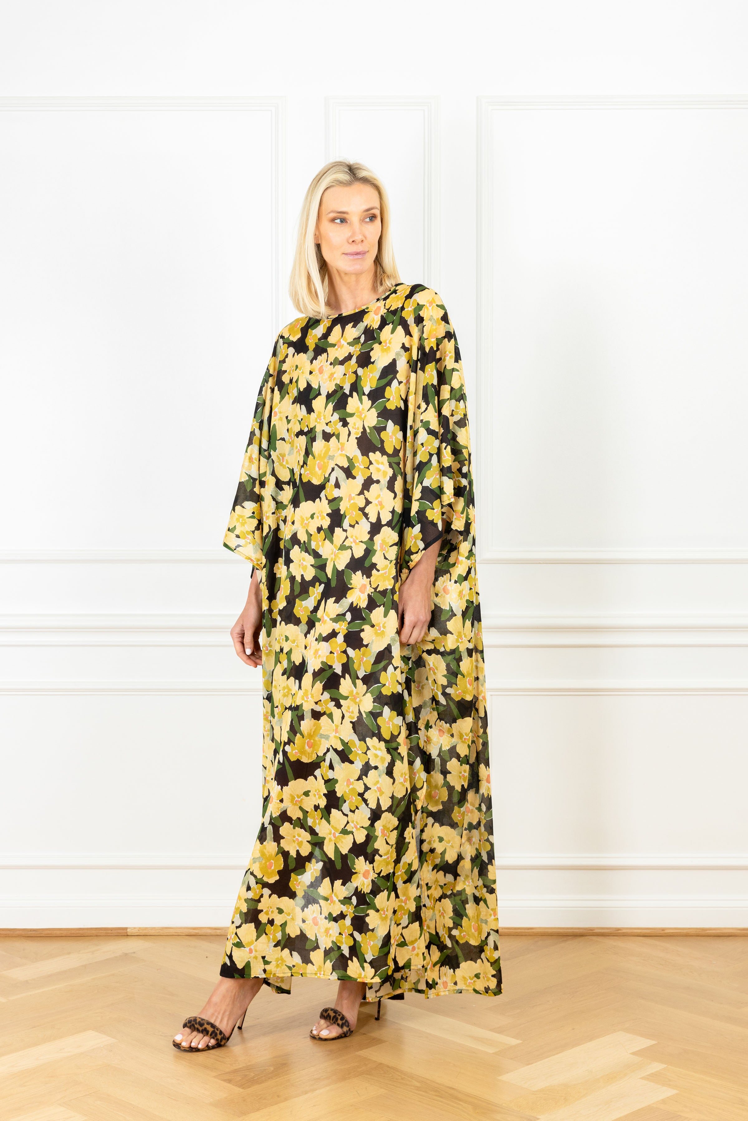 meet our keyhole caftan: this billowing silhouette cascades to the floor with a graceful flow. it features generously cut dolman sleeves for dramatic effect, and a spacious keyhole detail for an unexpected element. this caftan features large scattered florals in a hand-painted style on a 100% cotton fabrication.