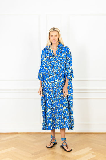 throw on our pullover silhouette in for your daily errands or your next dinner date. this playful dress is designed for everyday wear and features a subtle v-neck, a classic polo collar, and an airy sweeping skirt for a flirty finish. this dress features a dense floral design in lapis blue & lime green on a breezy fabrication.