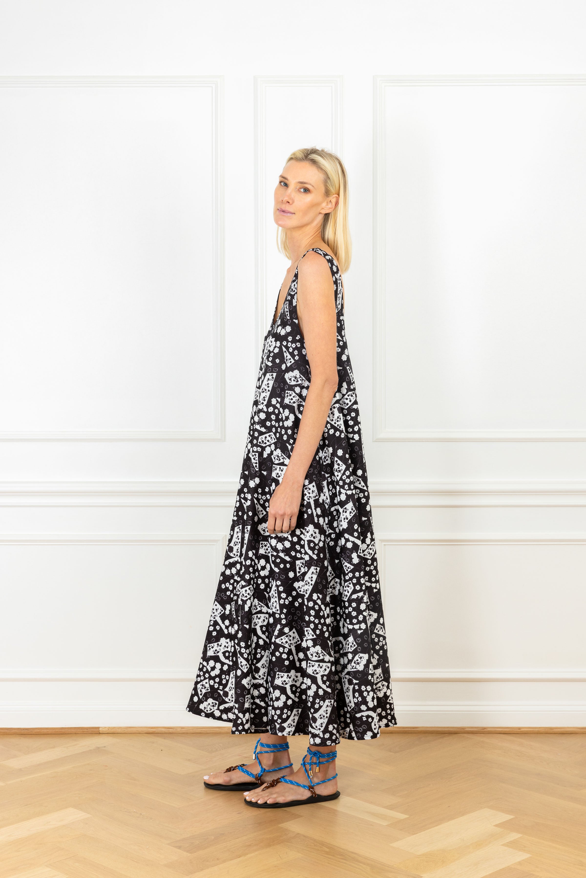 slip into this swingy tank silhouette for your next festivity. this dress features a black & white patchwork-inspired floral design with a diverse mix of small-scale motifs.
