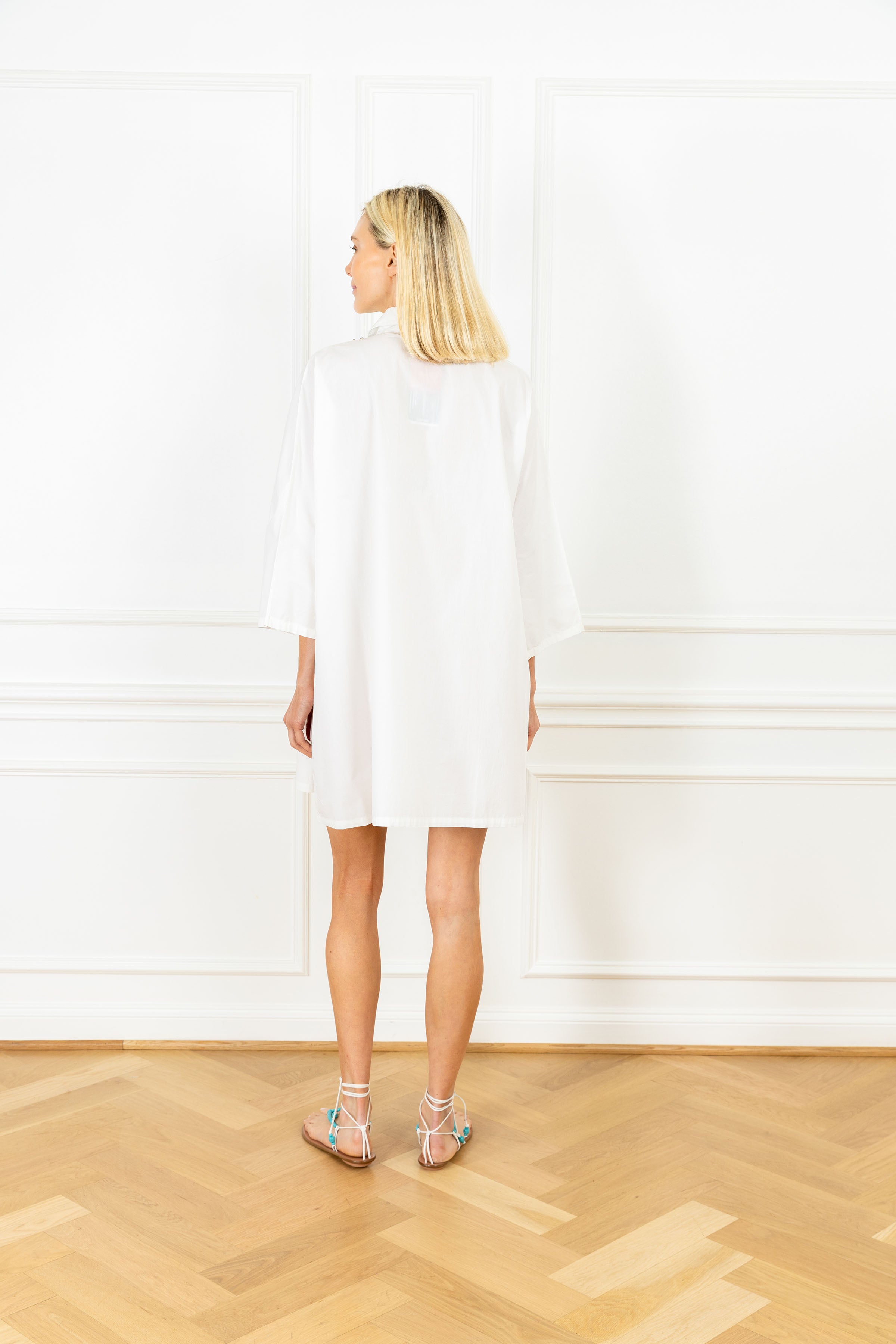 your favorite pullover silhouette is now offered in a mini! this playful dress is designed for everyday wear and features a subtle v-neck, a classic polo collar, and an airy sweeping skirt for a flirty finish. this dress features a crisp cotton fabrication, embellished with mixed crystals framing the neckline.