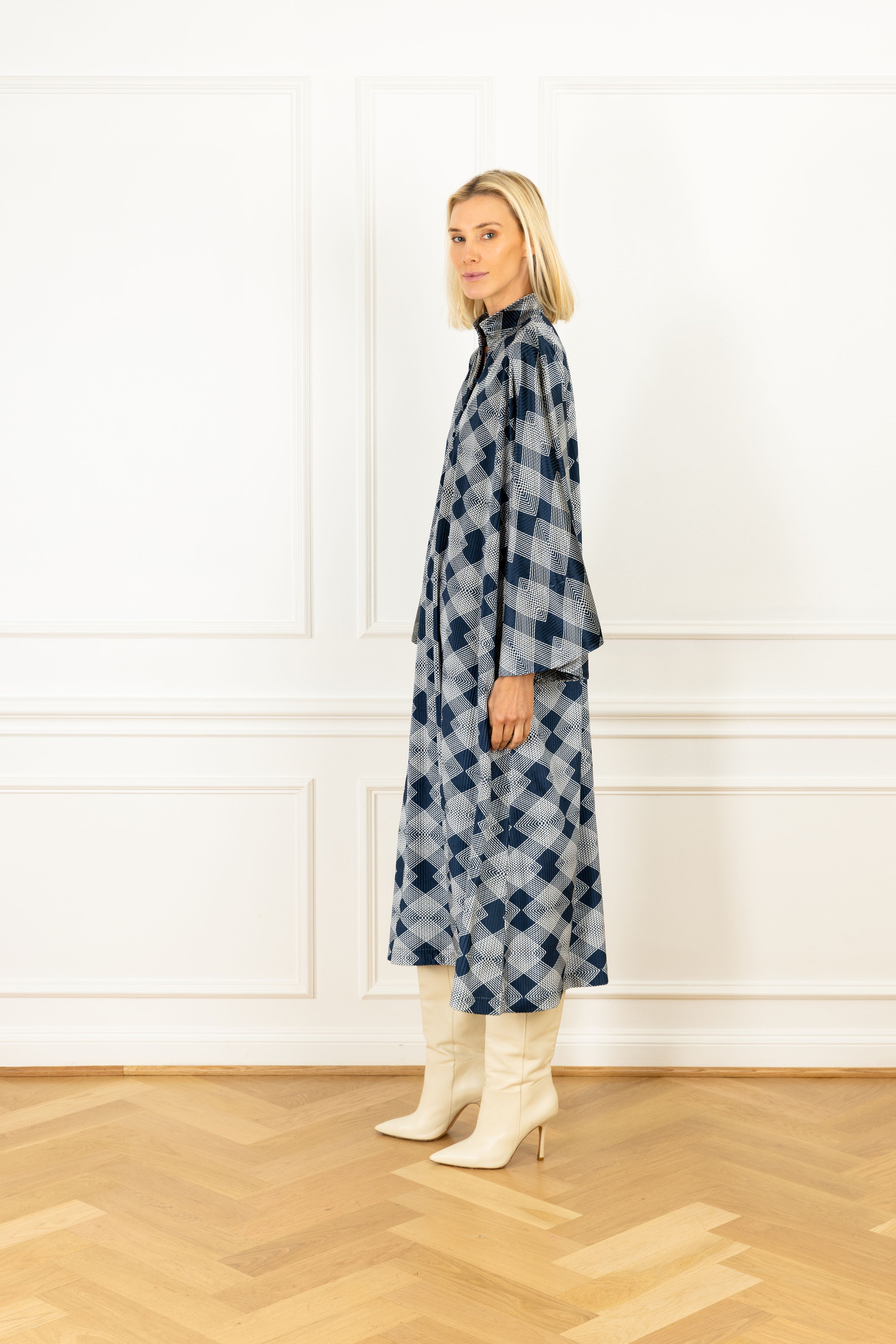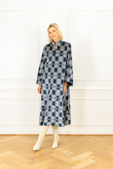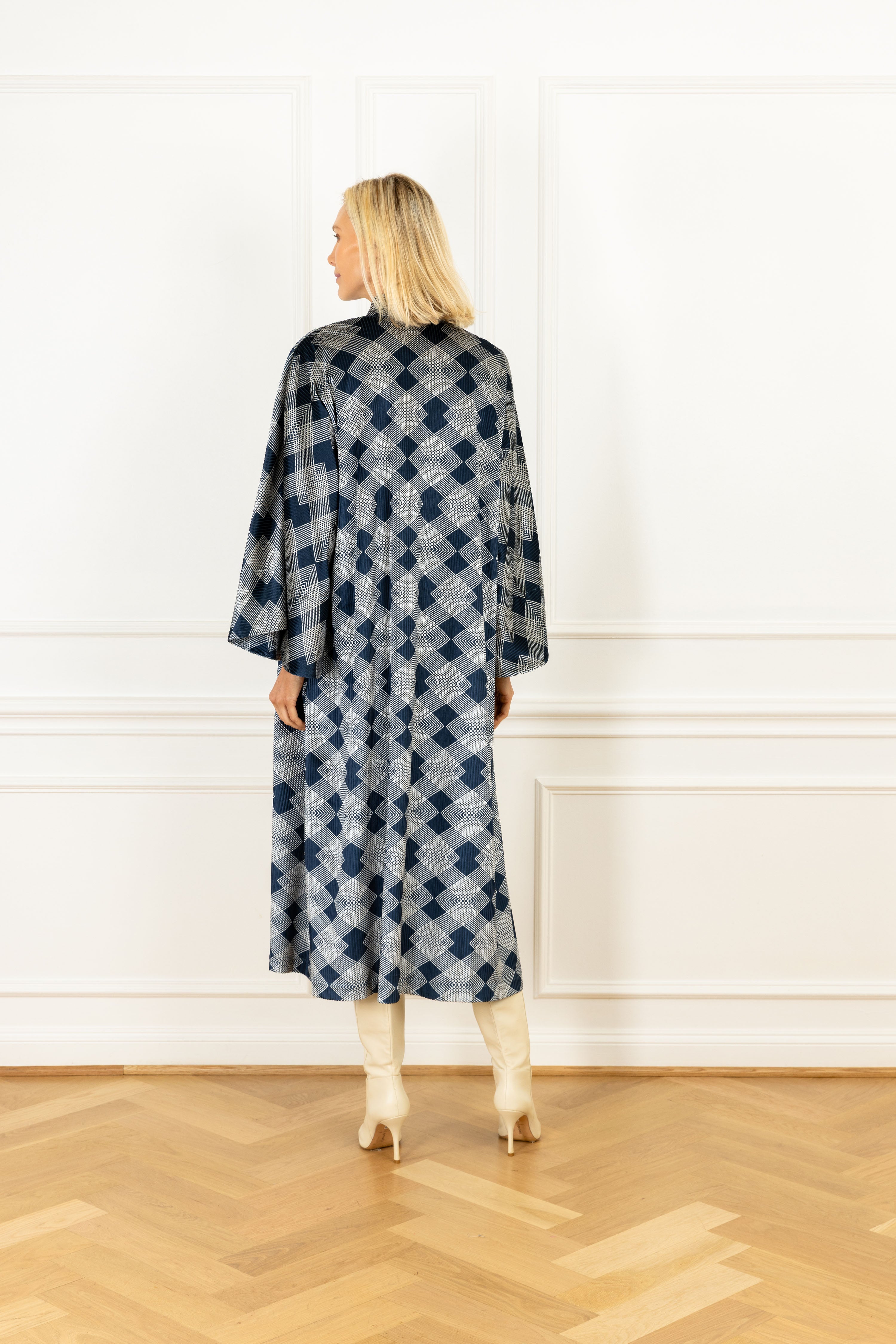 slip on our signature caftan silhouette for an effortless look that feels refined. this caftan features a complex geometric print of diamond & square shapes arranged in a grid on a soft ribbed velvet fabrication.