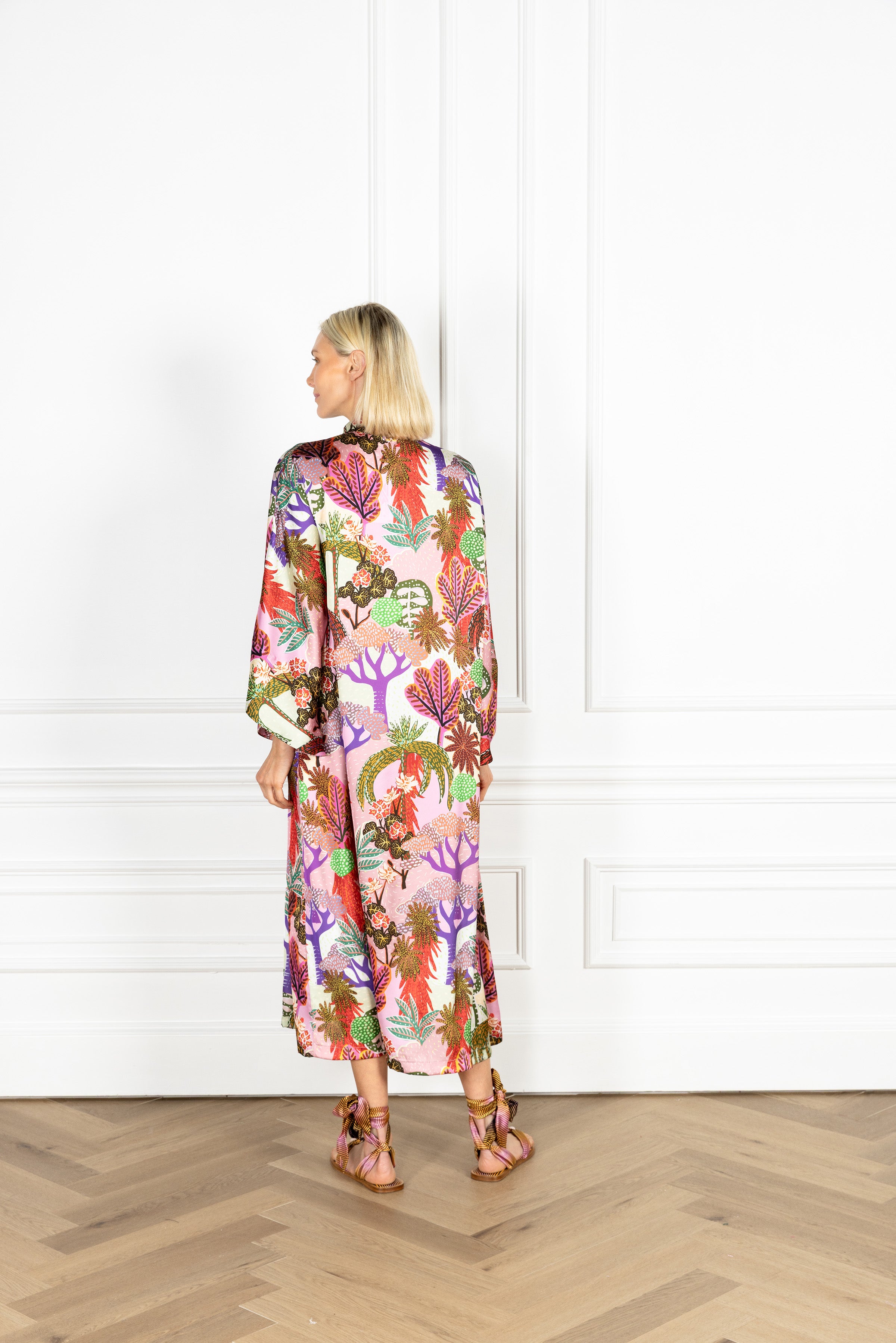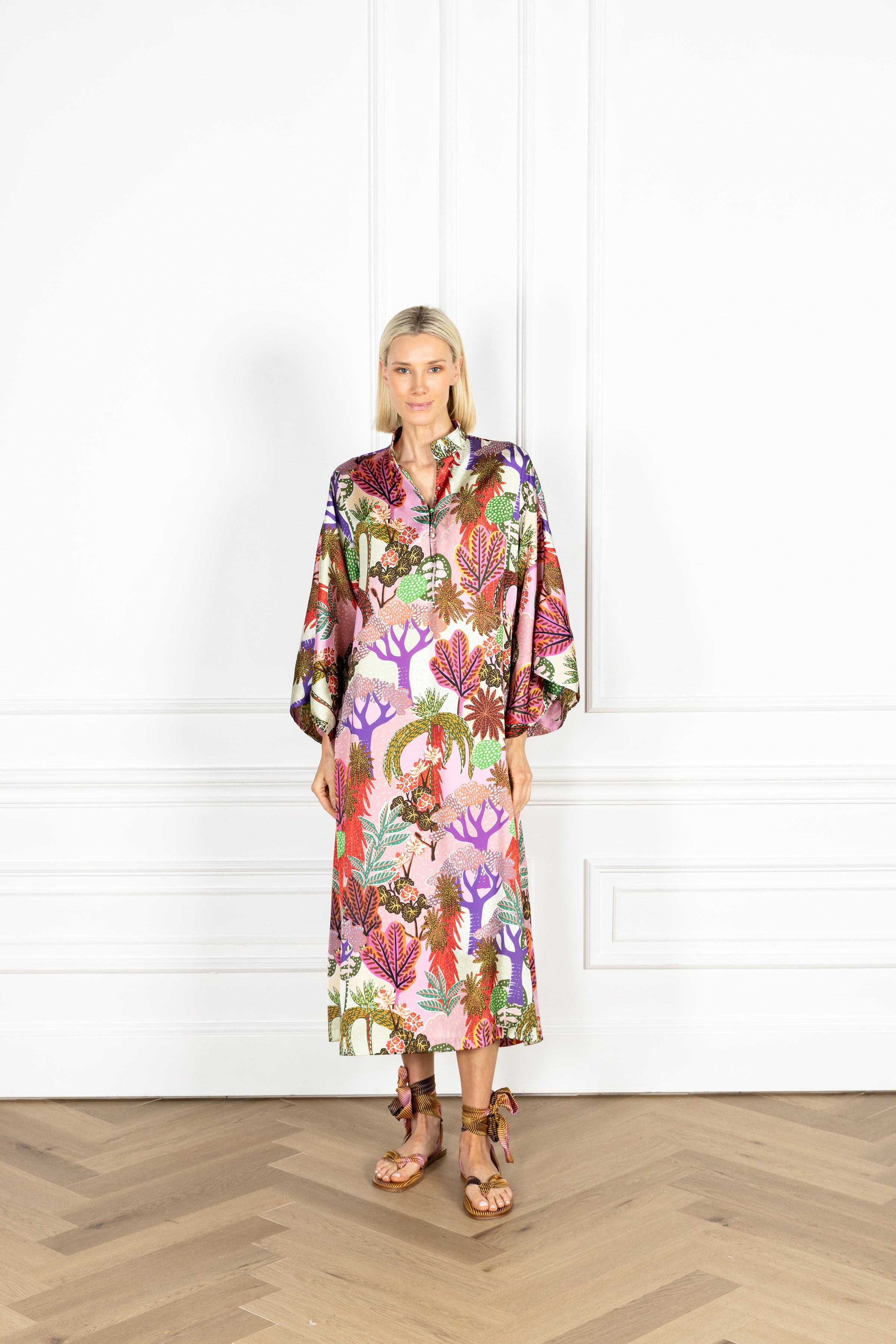 slip on our signature caftan silhouette for an effortless look that feels refined. this caftan features a whimsical forest scene composed of abstract trees in saturated hues, crafted in a smooth satin fabrication.