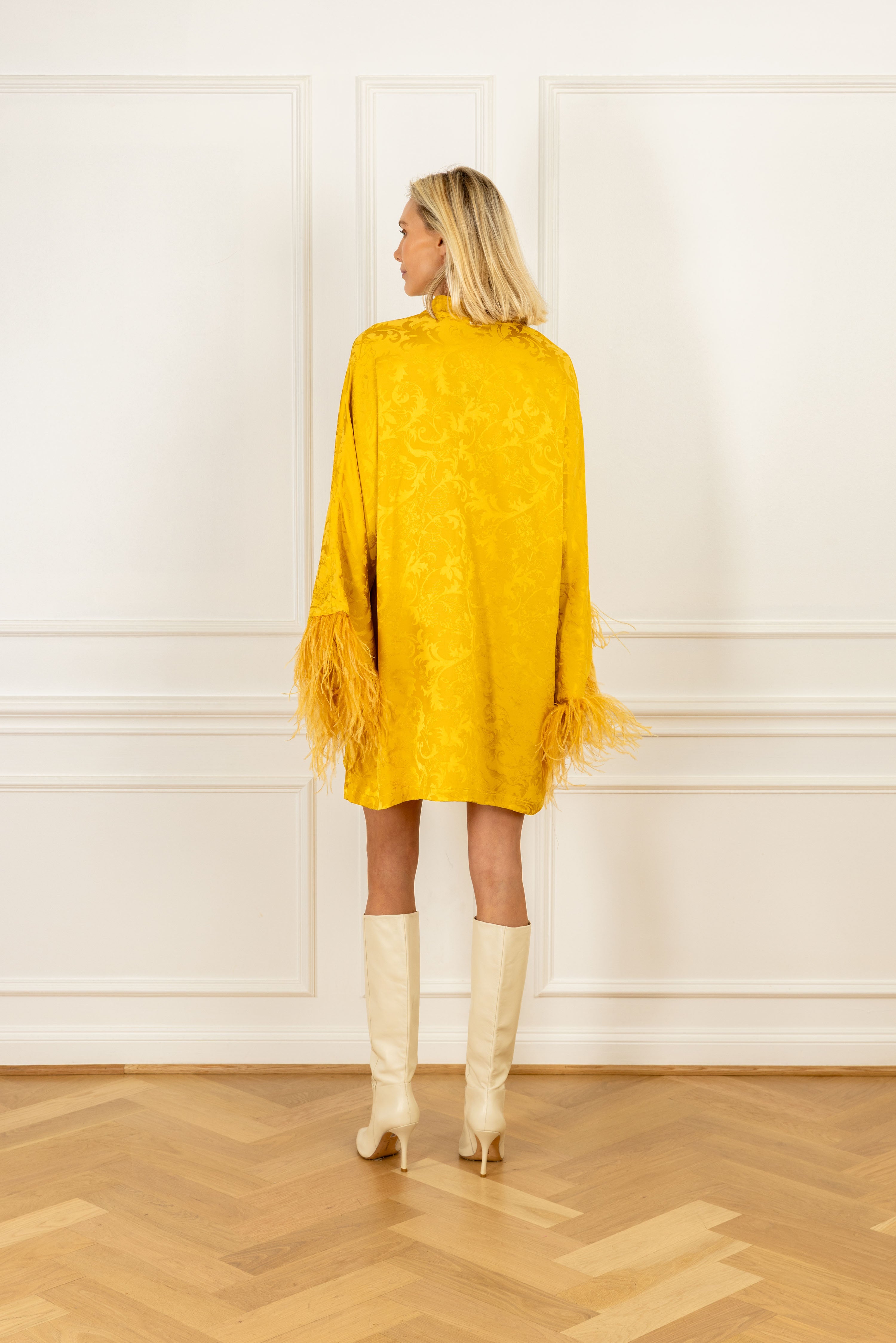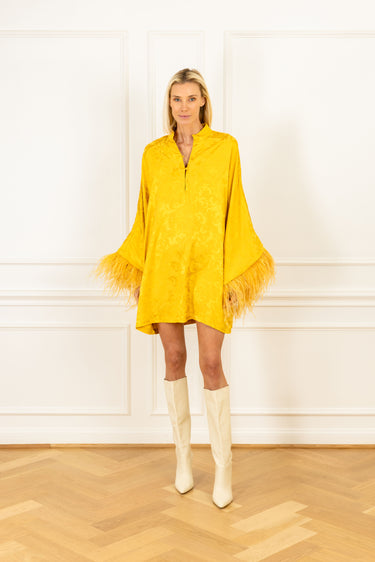 slip on our signature caftan silhouette for an effortless look that feels refined. this caftan features a baroque floral design in a rich amber color on a shiny satin fabrication.