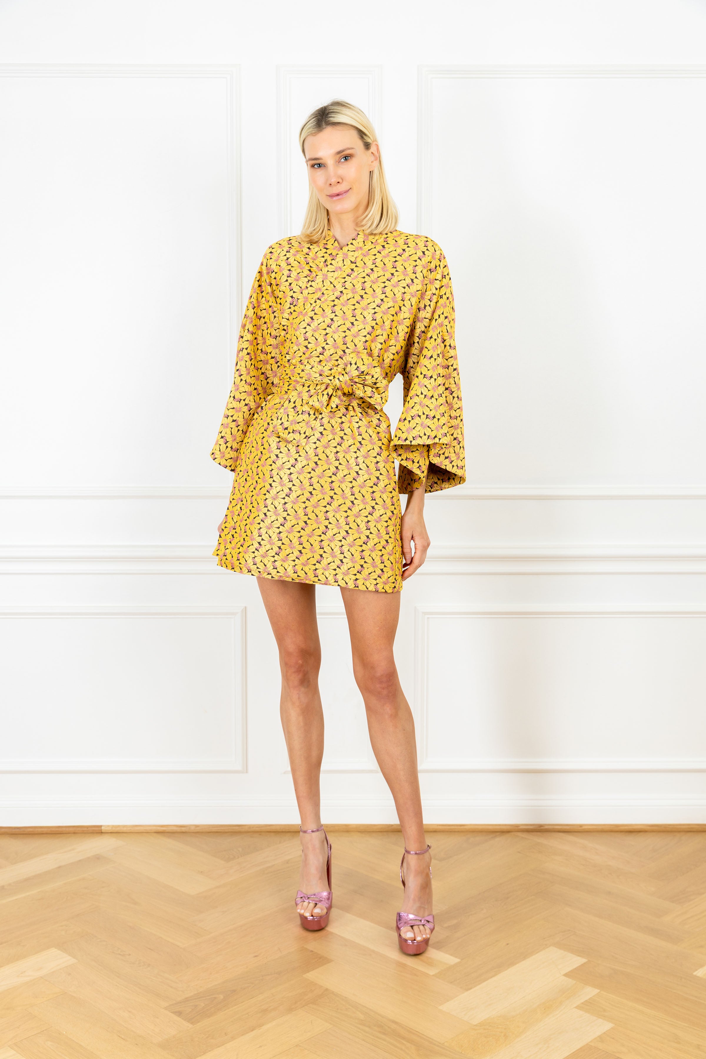 tie on this classic silhouette designed with an effortless flowy feel. this handcrafted piece has an easy drape, and evokes the label’s vintage-inspired aesthetic. this wrap features repeating daylily florals in yellow and pink, woven into a rich jacquard fabrication.