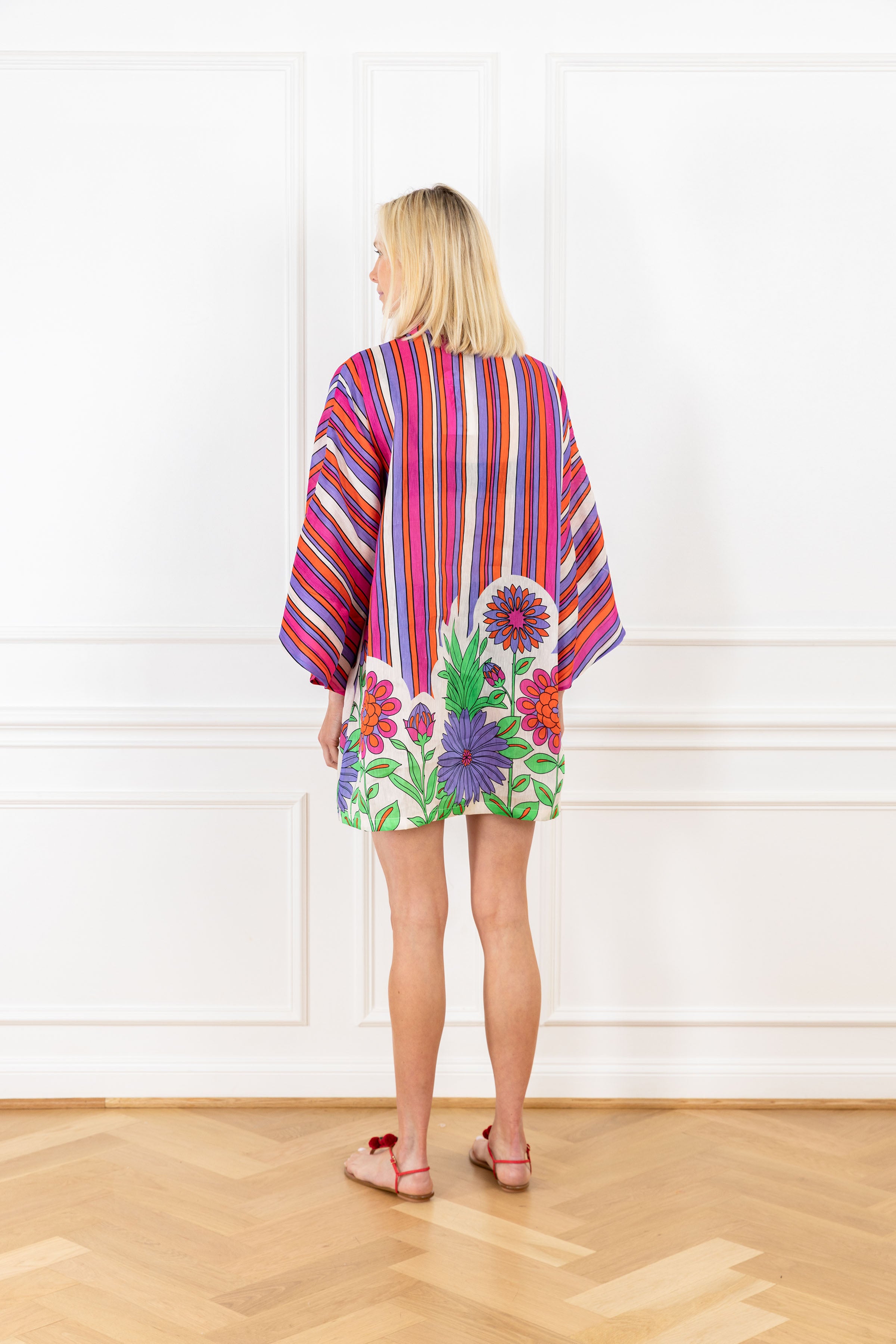 slip on our signature caftan silhouette for an effortless look that feels refined. this caftan features multicolored vertical stripes with green stemmed florals sprouting from the hem.