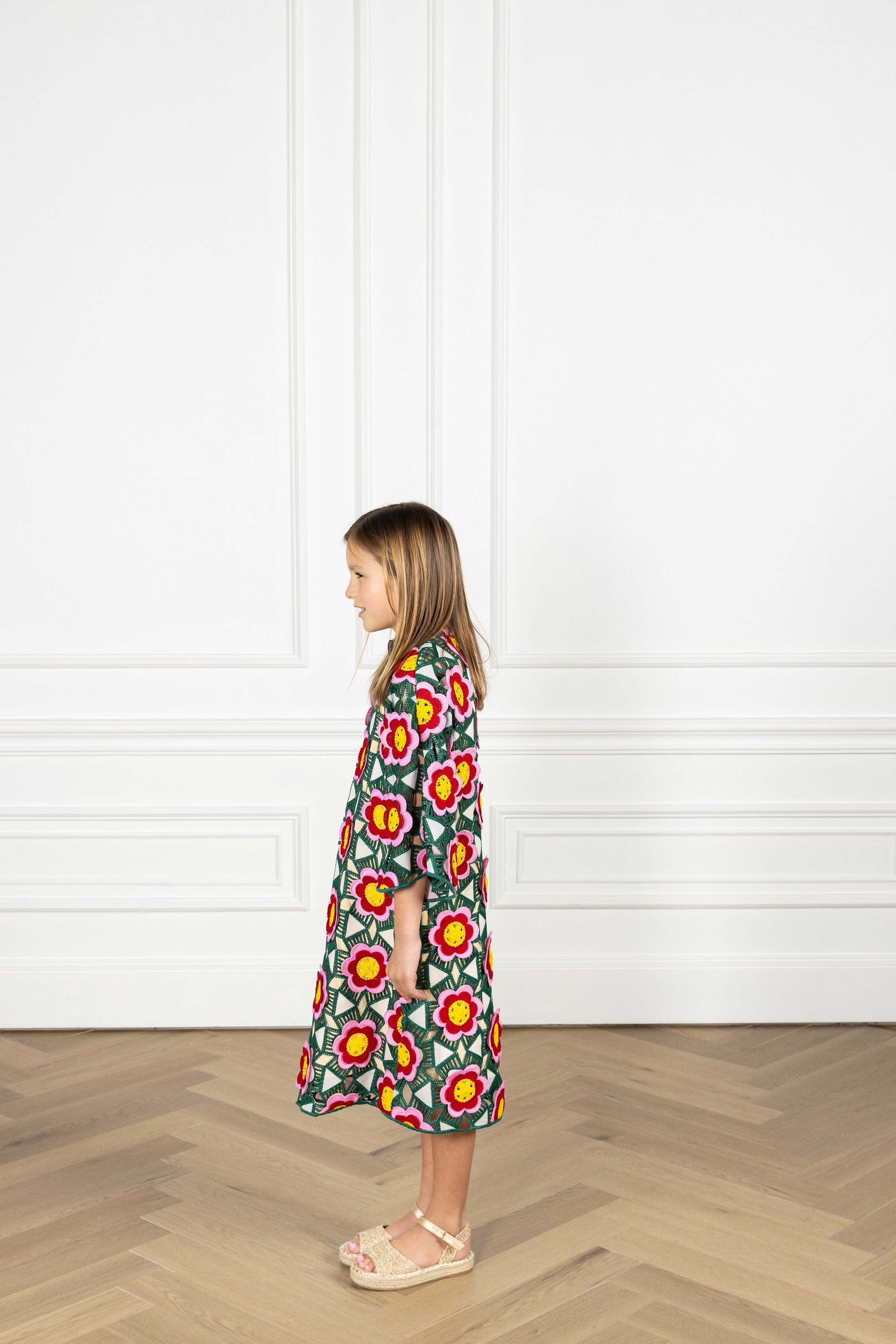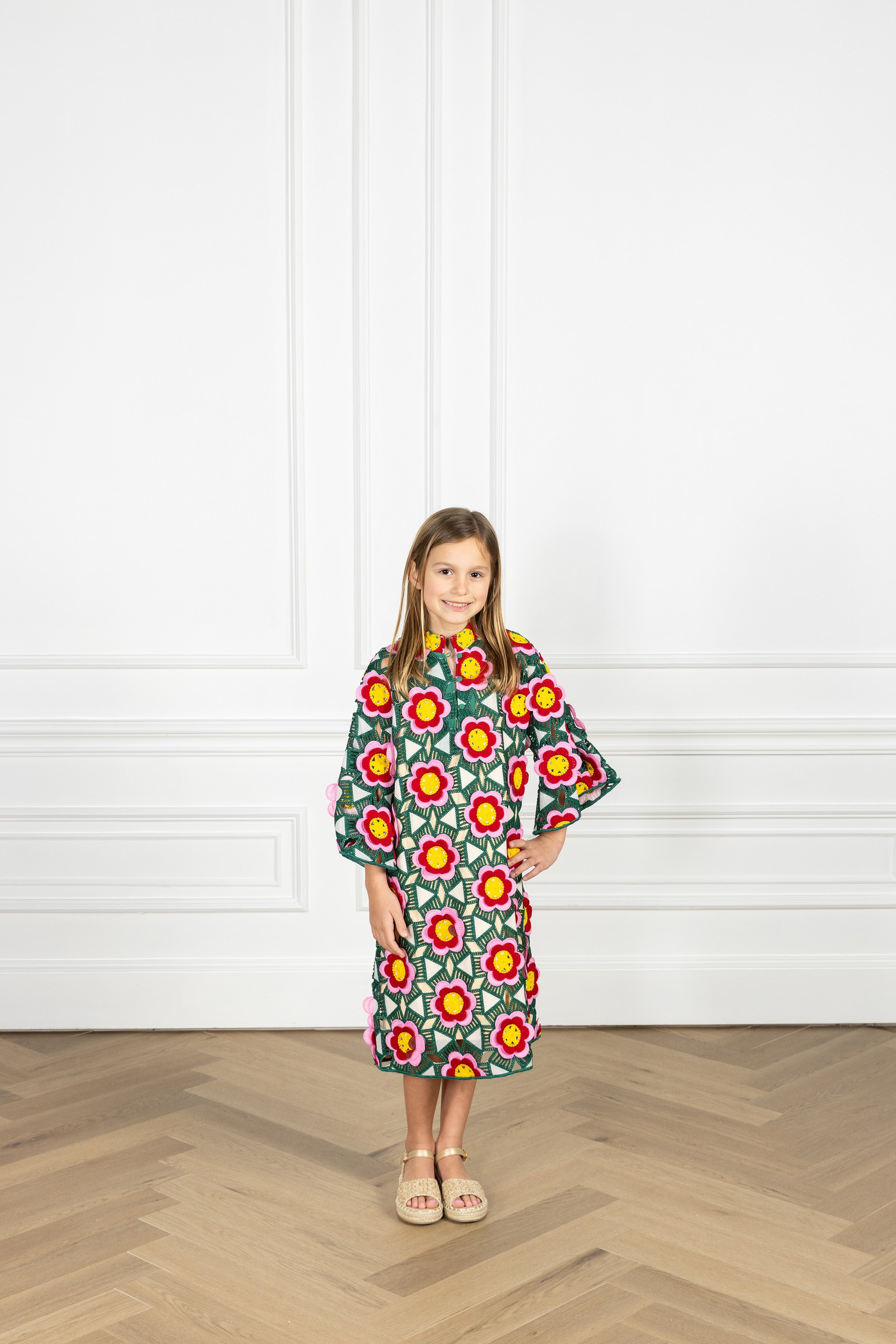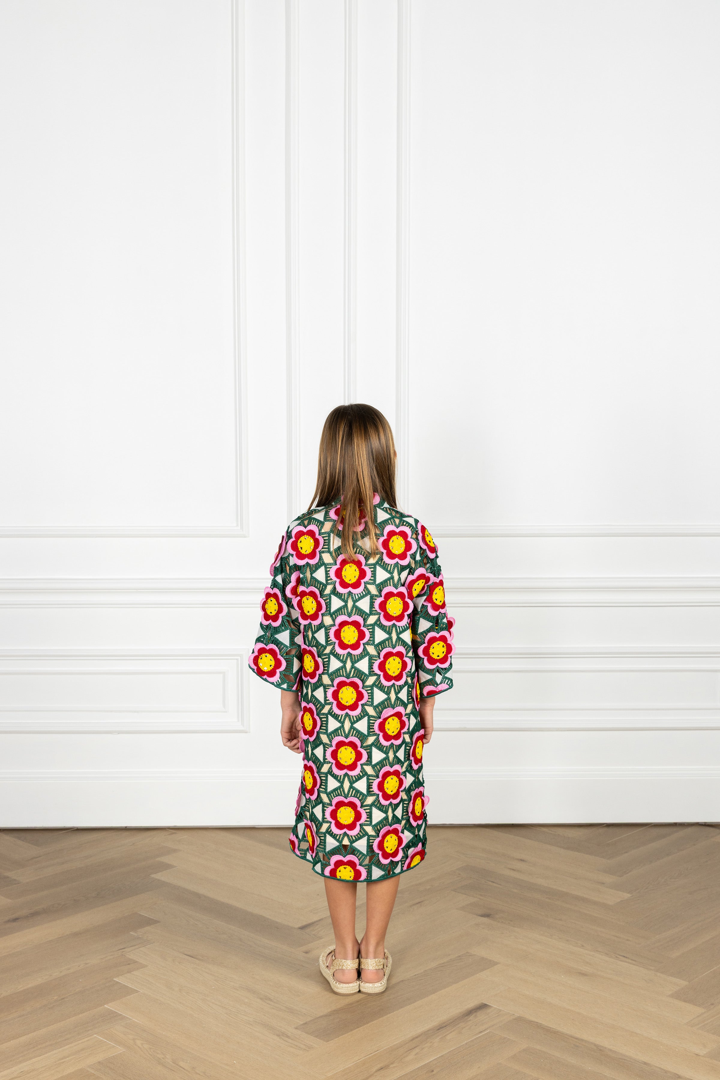 match with your mini! the kid’s caftan is our smaller take on the iconic women’s maxi caftan, carrying the same relaxed shape and bell sleeves in an effortlessly elevated silhouette - just like mom’s. this caftan features a mosaic design composed of layered florals against an open crochet geometric web.