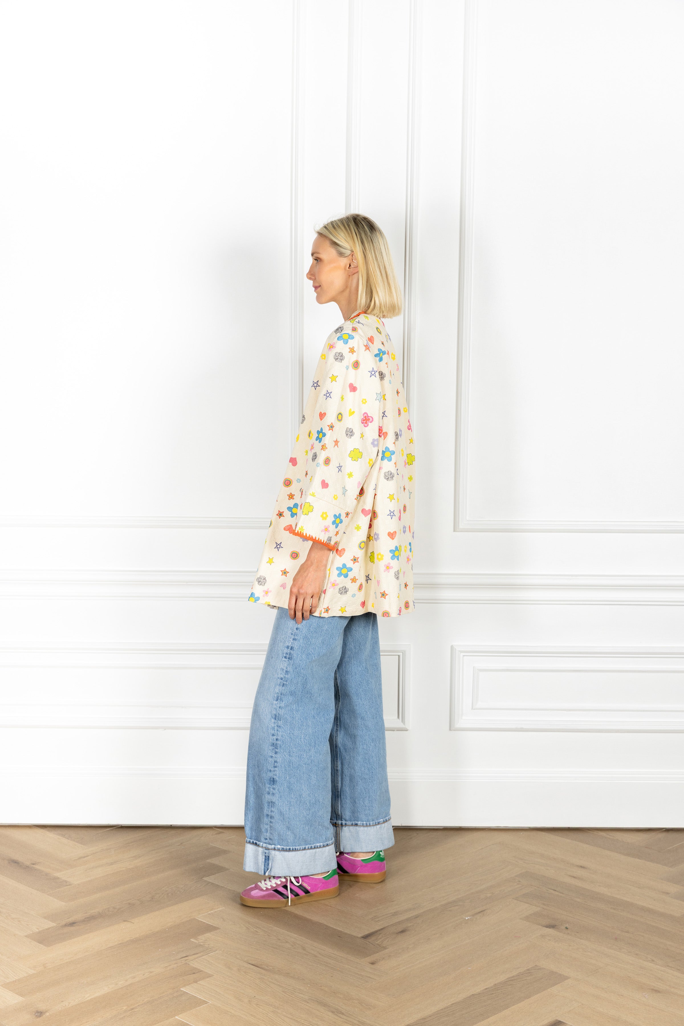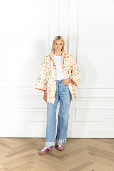 our dress coat is now offered in a mini! this short dress coat showcases a voluminous fit and can be worn open or closed. this piece is crafted in textured canvas and features scattered hearts, stars, and florals in bright hues, framed by a statement orange embroidered trim.