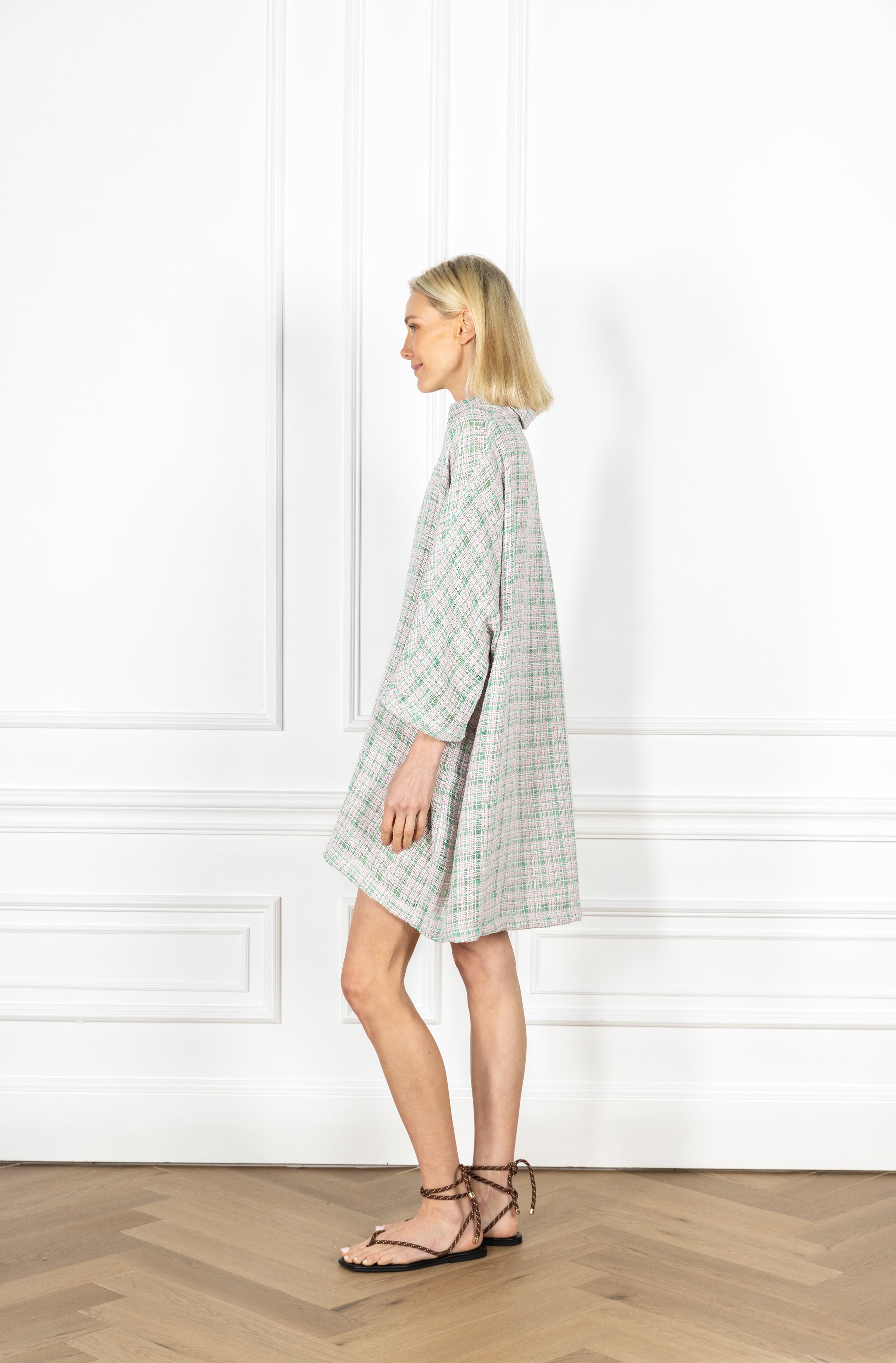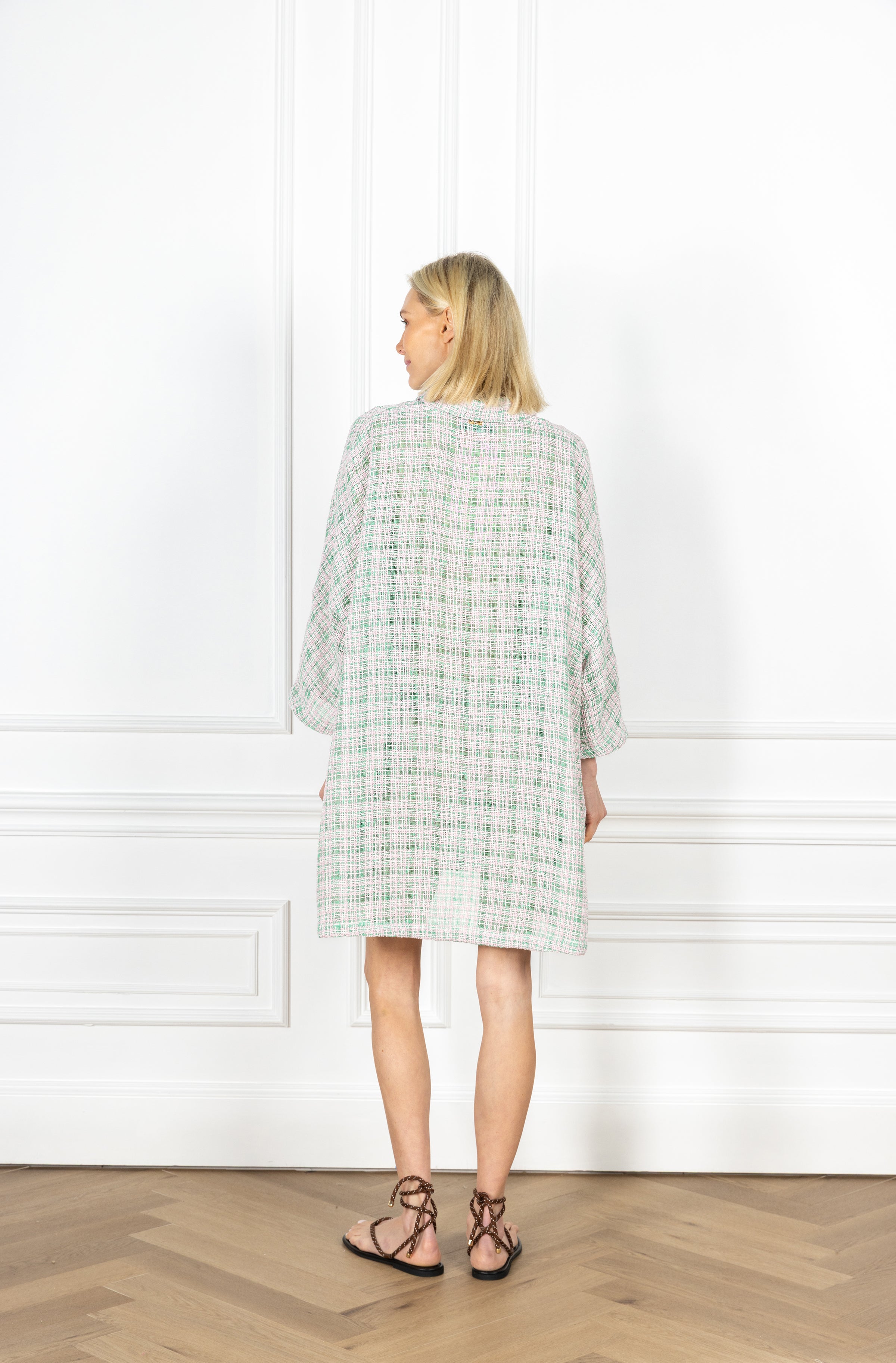 your favorite pullover silhouette is now offered in a mini! this playful dress is designed for everyday wear and features a subtle v-neck, a classic polo collar, and an airy sweeping skirt for a flirty finish. this dress features a lightweight tweed fabrication in a soft blend of ivy green, blush pink, and ivory, woven into a textured, grid-like design.