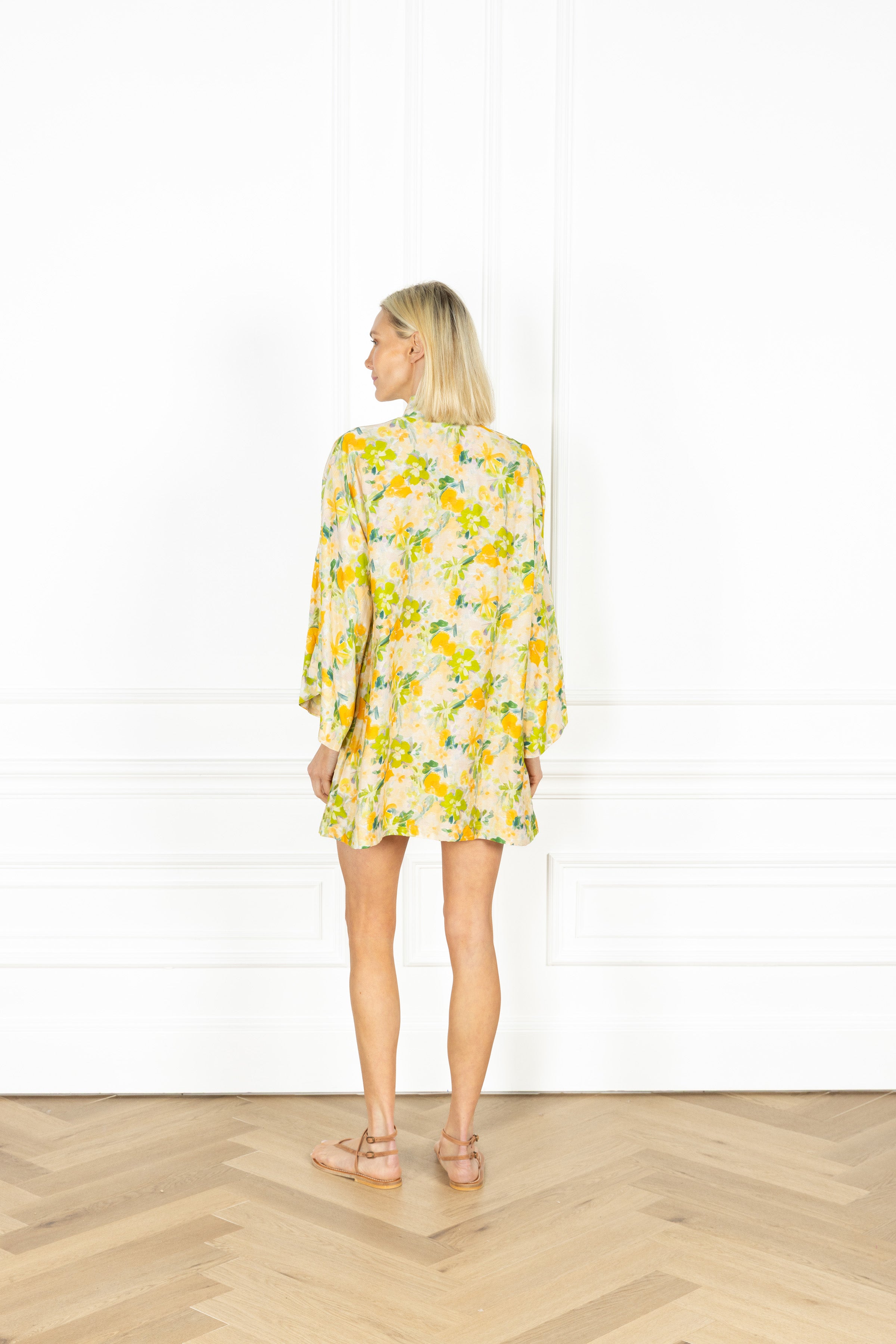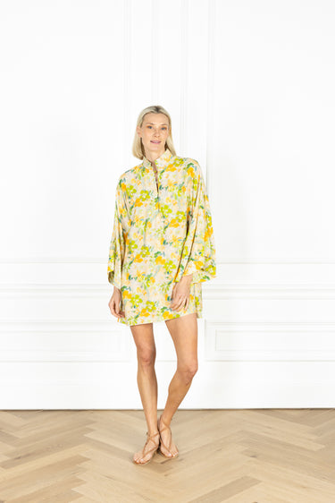 slip on our signature caftan silhouette for an effortless look that feels refined. this caftan features a soft, brushstroke-like floral design in shades of yellow and green, layered over a muted neutral base.