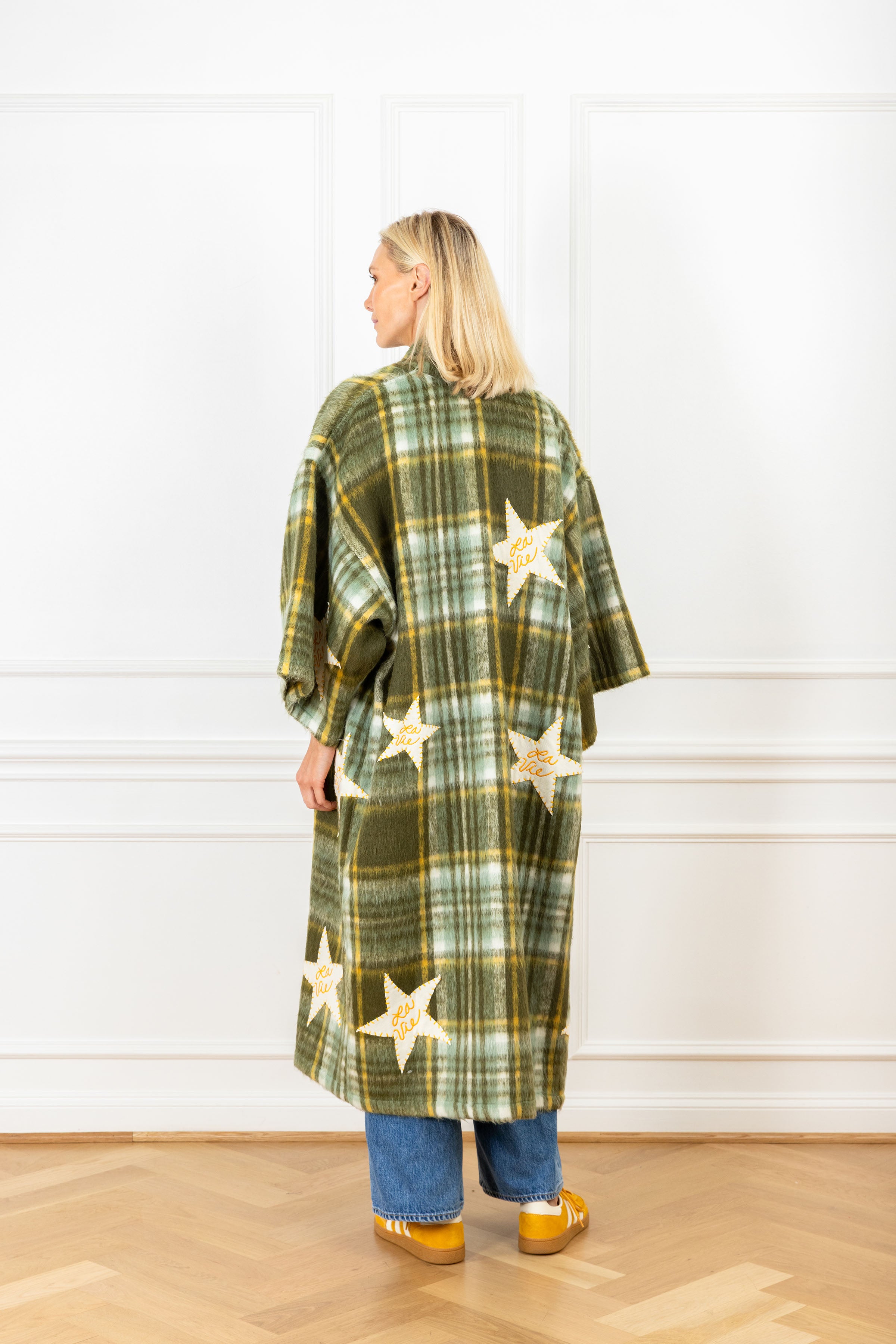 this duster features "La Vie" star patches on an olive plaid fuzzy fabrication. this handcrafted piece is the perfect oversized garment for a chilly day, and is the epitome of luxury and comfort wrapped in one.