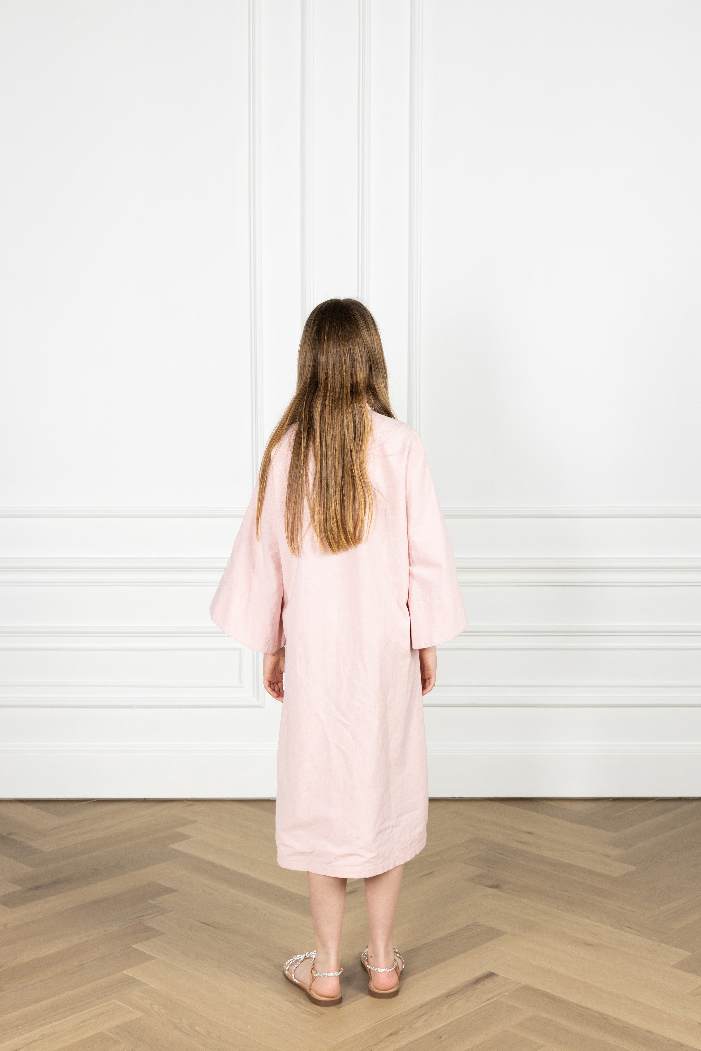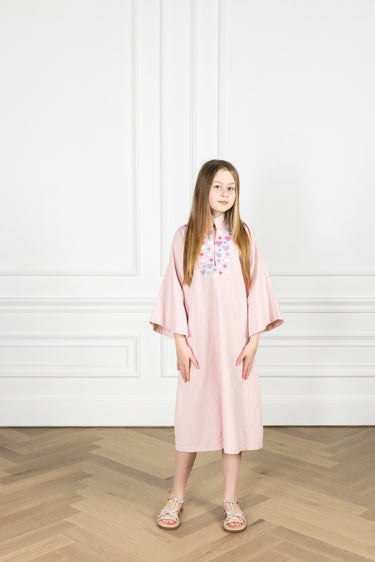 match with your mini! the kid’s caftan is our smaller take on the iconic women’s maxi caftan, carrying the same relaxed shape and bell sleeves in an effortlessly elevated silhouette - just like mom’s. this caftan is crafted from a soft cotton-linen blend in blush pink, accented with beaded heart and star motifs.